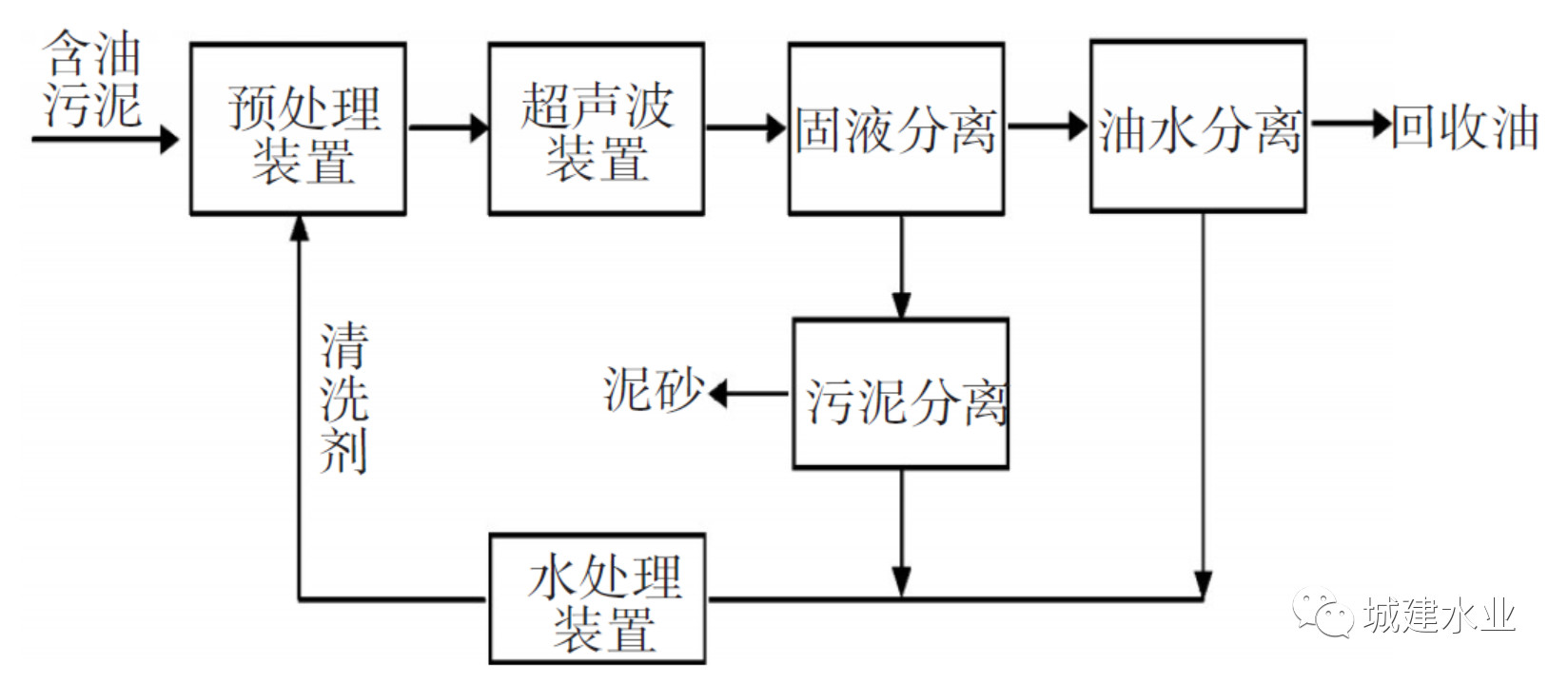 超聲處理技術是通過聲場的機械振動、空化效應及熱作用來破壞含油污泥的結構,降低污泥中原油的黏度,減小原油與無機固體間的黏附作用,從而使含油污泥中的油和泥砂分離。其工藝流程如圖3.5所示:①清洗劑預處理含油污泥;②超聲分離油泥,使原油與固體顆粒分離;③旋液分離器分離油水和泥砂,泥砂通過離心機脫水,油水經分離器分離出油。