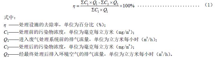 5.2.4 去除率可通過同時測定處理前后廢氣中污染物的排放濃度和排氣量,以被去除的污染物與處理之前的污染物的質(zhì)量百分比計,計算方法見式(1)。