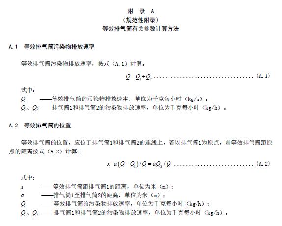 若有三根以上的近距排氣筒,且排放同一種污染物,應以前兩根的等效排氣筒,依次與第三、第四根排氣筒取等效值。等效排氣筒的有關(guān)參數(shù)按附錄A 規(guī)定計算。
