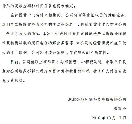 目前部固管中心尚未確定對(duì)金科環(huán)保規(guī)范拆解處理廢電器種類(lèi)和數(shù)量恢復(fù)審核的時(shí)間,廢舊電器電子產(chǎn)品基金補(bǔ)貼的發(fā)放金額和時(shí)間目前也尚未確定。在此期間,金科環(huán)保將暫停廢舊電器的拆解業(yè)務(wù),公司的持續(xù)經(jīng)營(yíng)能力存在較大的不確定性,提醒投資者注意投資風(fēng)險(xiǎn)。