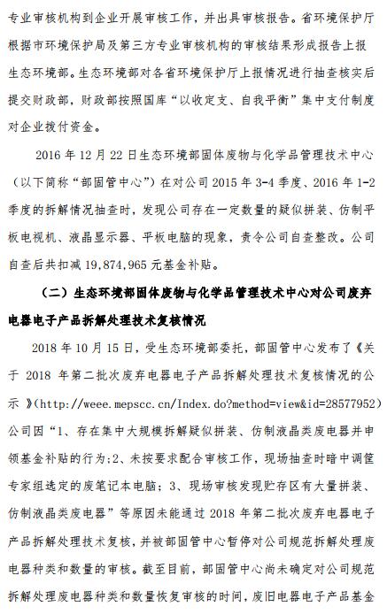公告顯示,金科環(huán)保廢舊電器拆解業(yè)務(wù)未通過(guò)審核的原因在于:1、存在集中大規(guī)模拆解疑似拼裝、仿制液晶類(lèi)廢電器并申領(lǐng)基金補(bǔ)貼的行為;2、未按要求配合審核工作,現(xiàn)場(chǎng)抽查時(shí)暗中調(diào)筐專(zhuān)家組選定的廢筆記本電腦;3、現(xiàn)場(chǎng)審核發(fā)現(xiàn)貯存區(qū)有大量拼裝、仿制液晶類(lèi)廢電器。