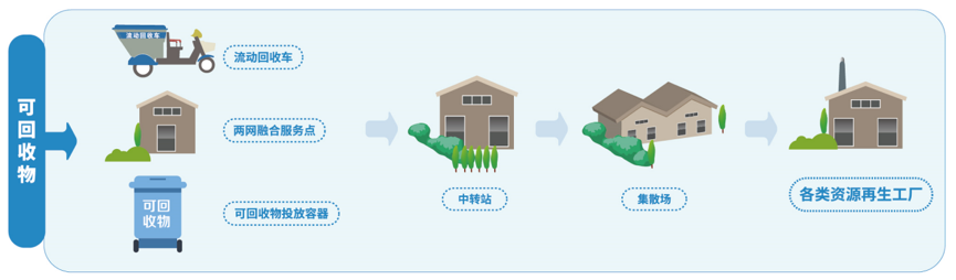 可回收物通過“直接賣給廢品回收企業(yè)”、“投放到設(shè)置在居住區(qū)公共區(qū)域可回收物收集容器中”、“投放到兩網(wǎng)融合服務(wù)站點(diǎn)”這三種方式進(jìn)入廢品回收系統(tǒng),然后經(jīng)再生資源回收服務(wù)點(diǎn)、站、場收集后,通過市場化渠道運(yùn)往各類再生資源工廠再生利用,變廢為寶。