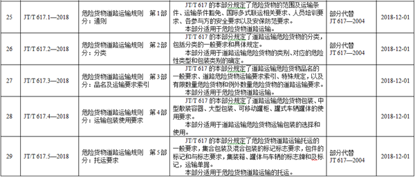 該標準將于2018年12月1日起實施。標準包括7個部分、600多頁、40多萬字,內(nèi)容完整、系統(tǒng)性強,對危險貨物分類、包裝、托運、裝卸、運輸?shù)拳h(huán)節(jié)的操作要求都進行了明確規(guī)定。