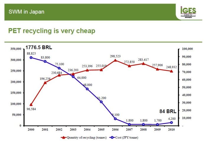 上圖:日本塑料PET回收量及回收成本變化