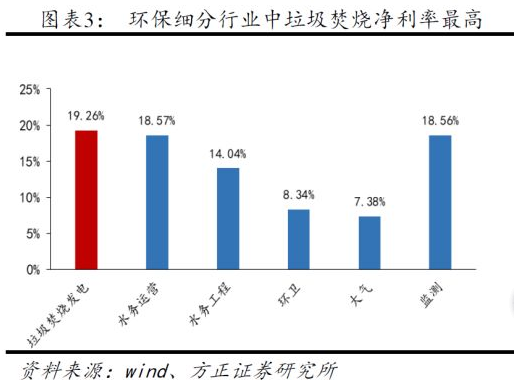 凈利率方面,2017年垃圾焚燒發(fā)電行業(yè)整體凈利率19.26%,高于其他細分行業(yè)。