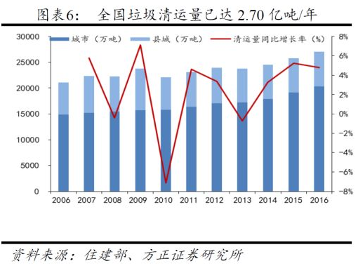 從生活垃圾產量角度,隨著我國城鎮(zhèn)化進程的推進,城市生活垃圾清運量逐年增長,2016年生活垃圾清運量已經達到2.70億噸,其中城市生活垃圾清運量2.03億噸,縣城生活垃圾清運量0.67億噸,并在以每年4%-5%的增速逐年攀升。