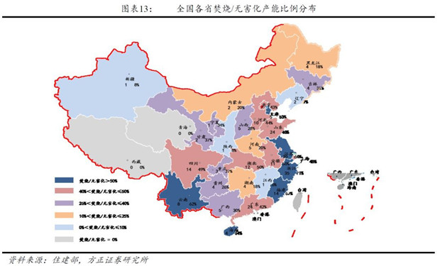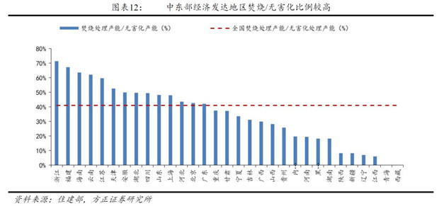 從焚燒處理占無害化產能比例來看,2016年全國焚燒處理占無害化處理比例為41%,全國有14個省焚燒處理占無害化處理比例超過該比例,且大多分布在中東部經濟發(fā)展程度較高的地區(qū),其中浙江省焚燒處理占無害化處理比例最高,達到了71%。