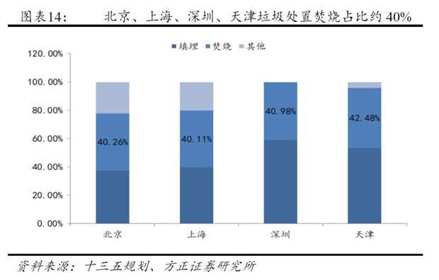 而從北京、上海、深圳、天津等大城市的生活垃圾處置能力來看,目前焚燒占比約40%,隨著早期填埋場的滿產及土地資源的稀缺,大型城市生活垃圾焚燒處置將是大勢所趨。