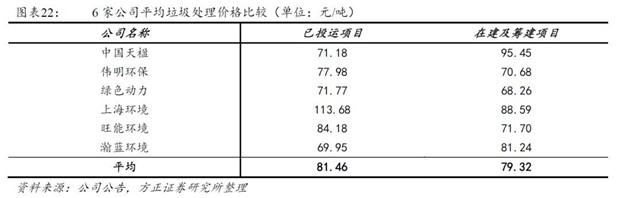 我們根據上市公司公開披露的項目信息統(tǒng)計,取各個項目垃圾處置價格的平均值,對6家A股上市公司進行比較。已投運項目平均處置價格81元/噸,在建及籌建項目平均處置價格79元/噸,行業(yè)競爭激烈導致行業(yè)整體垃圾處置價格有所下降。