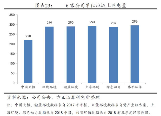 行業(yè)平均噸垃圾發(fā)電量為280-400度,其中自用電比例約20%,單位垃圾上網電量約220-300度,不同項目間差異性較大。我們根據已披露的公開信息得到部分公司單位垃圾發(fā)電量數據: