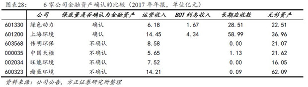 6家上市公司中,綠色動力、上海環(huán)境將保底垃圾處置費確認為金融資產-長期應收款,建設投資剩余部分確認為無形資產-特許經營權;而偉明環(huán)保、中國天楹、旺能環(huán)境、瀚藍環(huán)境將全部建設投資轉入無形資產。