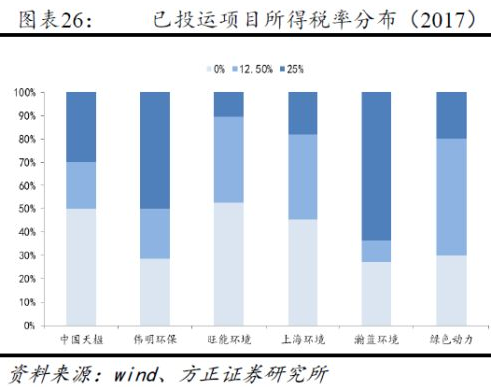 因此,根據項目投運時間不同,各公司的所得稅率存在一定差異。我們比較了6家上市公司合并報表層面的所得稅/利潤總額比例,其中偉明環(huán)保最低,為11.95%,主要是由于新投運的永強二期項目貢獻凈利潤較多;中國天楹最高,為22.68%,公司海外子公司的所得稅率較高所致。