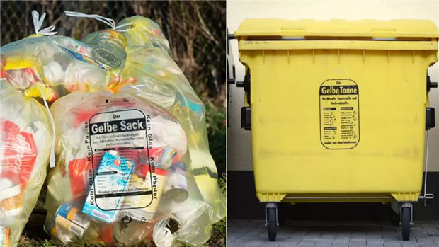 比如,黃桶(Gelbe Tonne)和黃袋(Gelber Sack)專門收集帶有綠點(diǎn)標(biāo)志(Der Grüne Punkt)的輕型包裝。 其中包括,例如:空飲料罐、塑料包裝或者利樂磚飲料包裝(Tetrapacks)等。另外,也可以把塑料瓶裝入專門發(fā)放的、或購買的塑料袋子里,集中投放回收。這種黃袋可以到政府相關(guān)部門免費(fèi)領(lǐng)取或從超市購買垃圾袋。