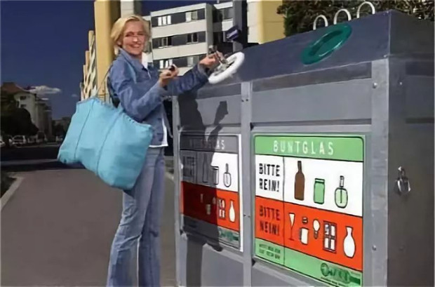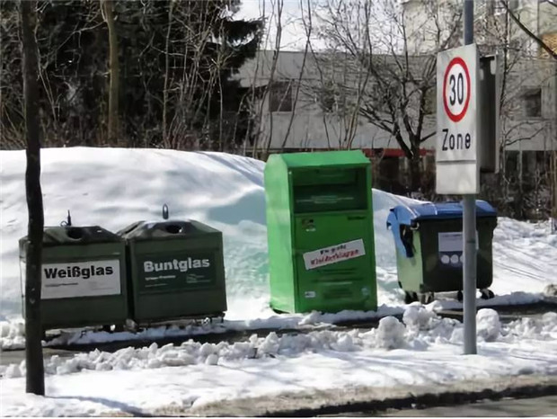 玻璃制品回收箱 :廢玻璃通過玻璃回收箱(Glascontainer)進(jìn)行回收。同時(shí)有白色玻璃、雜色玻璃之分。有兩點(diǎn)事項(xiàng)需要注意:第一,請(qǐng)勿將帶有押金的包裝瓶(Pfandflaschen)丟入回收桶中;第二,玻璃瓶在丟棄前要去除瓶蓋,因?yàn)槠可w屬于黃桶廢棄物。
