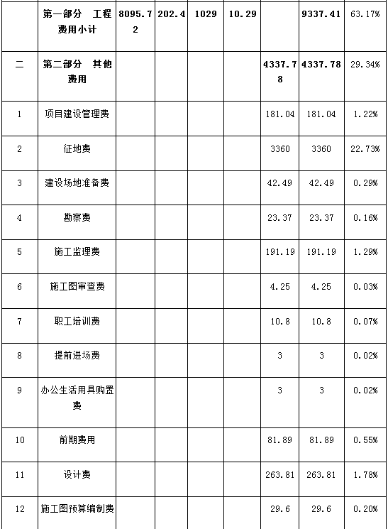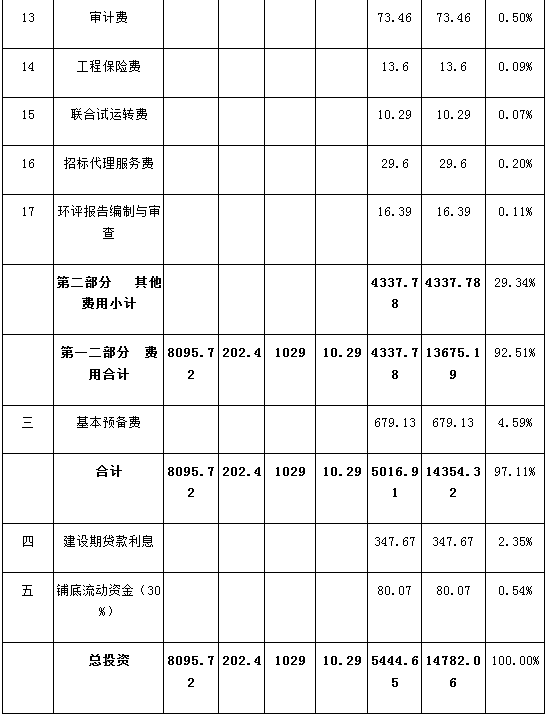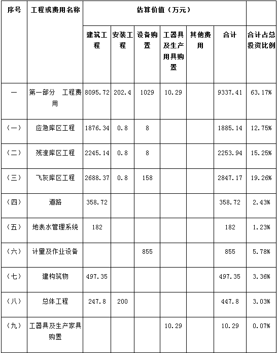 根據(jù)《揚州市趙莊垃圾衛(wèi)生填埋場二期工程可行性研究報告》,本項目總投資為14782.06萬元,主要包括工程費用9337.41萬元、工程建設其他費用4337.78萬元、基本預備費679.13萬元、建設期貸款利息347.67萬元、鋪底流動資金80.07萬元。見表一
