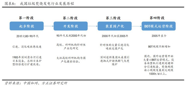 我國(guó)垃圾焚燒發(fā)電行業(yè)起步于20世80年代末,通過(guò)引進(jìn)國(guó)外先進(jìn)的焚燒設(shè)備和技術(shù),消化吸收優(yōu)化,先后經(jīng)歷了產(chǎn)業(yè)化研發(fā)、裝置國(guó)產(chǎn)化等階段。