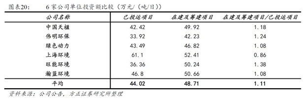 項(xiàng)目投資建設(shè)決定了在建工程轉(zhuǎn)無(wú)形資產(chǎn)的賬面價(jià)值,通過(guò)折舊攤銷間接影響運(yùn)營(yíng)期盈利能力,而建設(shè)總投資中設(shè)備購(gòu)置占比約50%。比較6家公司單位垃圾處置投資額,偉明環(huán)保最低,上海環(huán)境最高,與設(shè)備是否自產(chǎn)和成本管控有關(guān)。