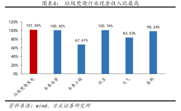 從現(xiàn)金收入比來(lái)看,2017年垃圾焚燒發(fā)電現(xiàn)金收入比101.55%,高于其他細(xì)分行業(yè),表現(xiàn)出運(yùn)營(yíng)類業(yè)務(wù)良好的現(xiàn)金流情況。