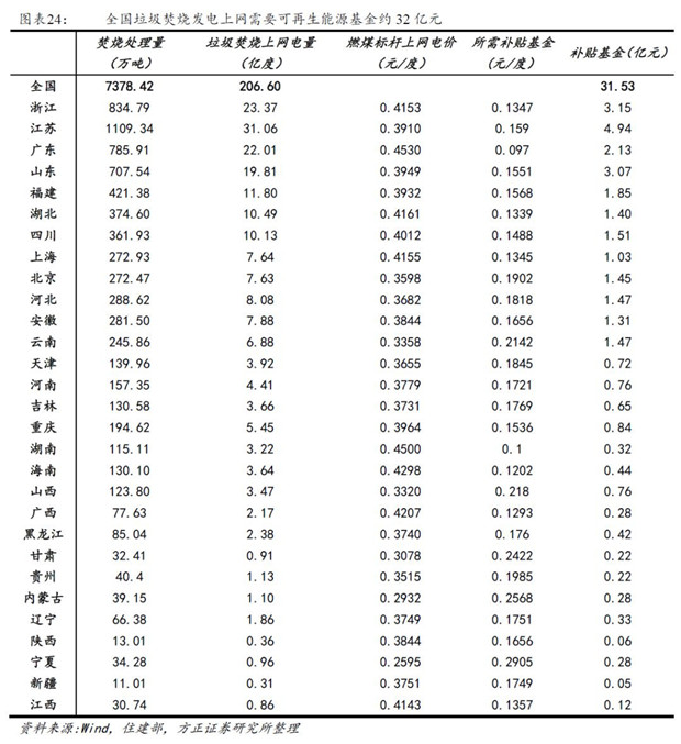按照2016年各省垃圾焚燒處置量,噸垃圾上網(wǎng)電量280度測(cè)算,全國(guó)垃圾焚燒發(fā)電上網(wǎng)需要可再生能源基金約32億元。