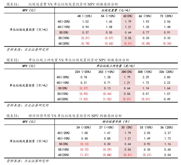 通過(guò)敏感性測(cè)試,項(xiàng)目NPV影響因素由大到小依次為:?jiǎn)挝煌顿Y額>單位垃圾上網(wǎng)電量>特許經(jīng)營(yíng)期限>垃圾處置費(fèi)。單位投資額對(duì)于項(xiàng)目NPV影響最大,建設(shè)期成本管控對(duì)于項(xiàng)目整體估值影響最大;其次為單位垃圾上網(wǎng)電量,受到垃圾熱值、焚燒設(shè)備效率、自用電比例等因素影響;其次為特許經(jīng)營(yíng)年限;最后為垃圾處置費(fèi)。