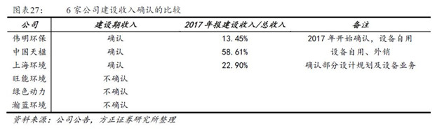 6家上市公司中,綠色動(dòng)力、上海環(huán)境將保底垃圾處置費(fèi)確認(rèn)為金融資產(chǎn)-長(zhǎng)期應(yīng)收款,建設(shè)投資剩余部分確認(rèn)為無(wú)形資產(chǎn)-特許經(jīng)營(yíng)權(quán);而偉明環(huán)保、中國(guó)天楹、旺能環(huán)境、瀚藍(lán)環(huán)境將全部建設(shè)投資轉(zhuǎn)入無(wú)形資產(chǎn)。