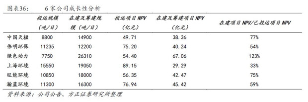 通過(guò)在建及籌建項(xiàng)目NPV/已投運(yùn)項(xiàng)目NPV的指標(biāo)來(lái)表現(xiàn)公司成長(zhǎng)性,成長(zhǎng)性由高到低依次為:綠色動(dòng)力、中國(guó)天楹、旺能環(huán)境、偉明環(huán)保、瀚藍(lán)環(huán)境、上海環(huán)境。