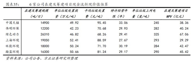 在建及籌建項(xiàng)目中,處置價(jià)格由高到低依次為中國(guó)天楹、上海環(huán)境、瀚藍(lán)環(huán)境、旺能環(huán)境、偉明環(huán)保、綠色動(dòng)力。