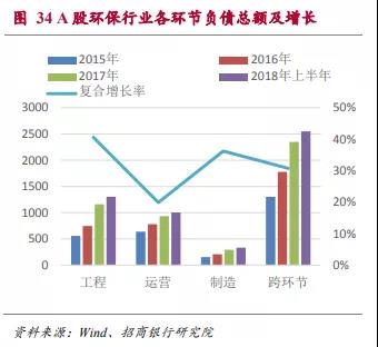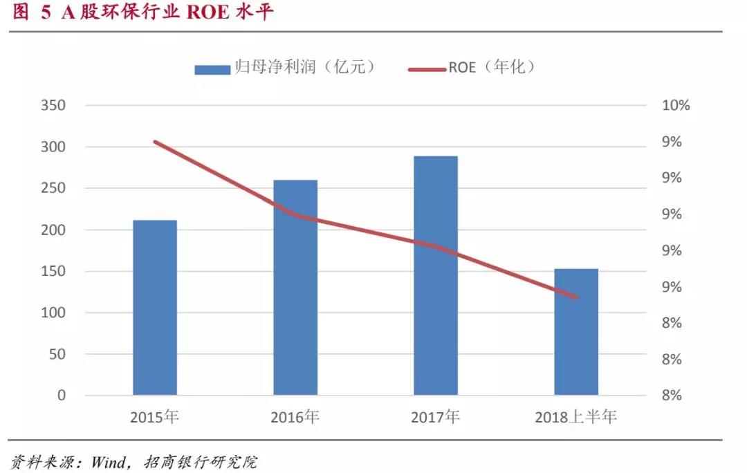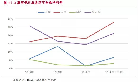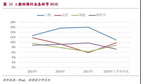 2015年到2017年環(huán)保類上市公司的ROE分別為9.4%、9.0%和8.3%,有逐年下降的趨勢(由于環(huán)保工程類項(xiàng)目大多數(shù)結(jié)算集中于下半年,2018年上半年年化以后的ROE水平明顯略低屬于正常情況)。在后文的分析中可以看出行業(yè)ROE水平的下降主要是受到運(yùn)營和制造環(huán)節(jié)ROE下滑的影響。2018年上半年這兩個(gè)領(lǐng)域的ROE水平已經(jīng)開始回升,因此整體行業(yè)ROE下滑的趨勢可能會(huì)改變。