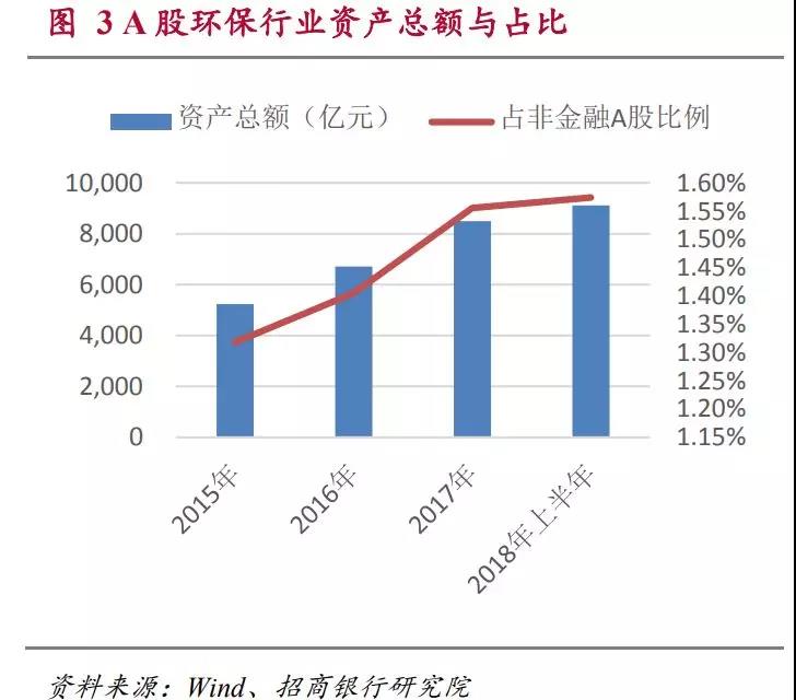 上市公司中,環(huán)保行業(yè)資產(chǎn)呈現(xiàn)逐步增長的趨勢。從2015年底到2018年上半年,環(huán)保行業(yè)A股上市公司的資產(chǎn)總額從5231億增加到9124億,年復(fù)合增長率為24.9%,快于A股總體資產(chǎn)的增長。本行業(yè)資產(chǎn)占A股總資產(chǎn)的比重從2015年年底的1.32%,上升到2018年的年中的1.57%。