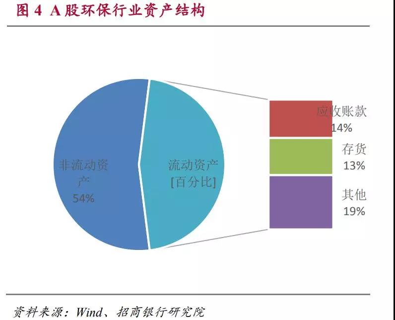 在環(huán)保類上市公司的資產(chǎn)結(jié)構(gòu)中,非流動(dòng)資產(chǎn)占比偏高,占到54%。而在46%的流動(dòng)資產(chǎn)中,應(yīng)收賬款和存貨的占比較高,這兩項(xiàng)分別占總資產(chǎn)的14%和13%。而其他流動(dòng)資產(chǎn)合計(jì)僅占到總資產(chǎn)的19%。