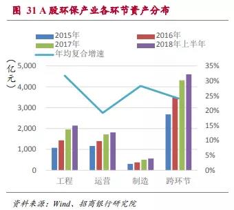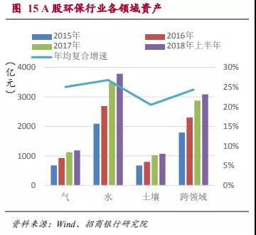 在各領(lǐng)域的資產(chǎn)中,水體環(huán)保的資產(chǎn)在A股環(huán)保行業(yè)資產(chǎn)中占比最高,2018年上半年占到了41.44%。同時(shí)這一領(lǐng)域增速也是最快的,達(dá)到26.76%。由于水體環(huán)保在未來的3-5年內(nèi)還將是我國環(huán)保治理的重點(diǎn)領(lǐng)域。我們預(yù)計(jì)這種趨勢還將持續(xù)一段時(shí)間。另外,隨著非電工業(yè)“超低排放”標(biāo)準(zhǔn)的推行,未來大氣環(huán)保在全領(lǐng)域中的資產(chǎn)占比或也將有所提升。