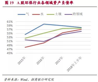 圖18顯示過去的3年里,在A股環(huán)保行業(yè)的各領(lǐng)域中,水體環(huán)保的負(fù)債上升速度最快,增速達(dá)到了30%以上。同時(shí)水體環(huán)保也因此從資產(chǎn)負(fù)債率最低的領(lǐng)域快速上升至與平均水平接近。目前4個(gè)領(lǐng)域的資產(chǎn)負(fù)債率有趨于一致的趨勢,都略低于60%。