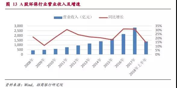 十年來,A股環(huán)保上市公司的營業(yè)收入經(jīng)歷了兩輪快速成長期,分別是09-11年和15-17年。這兩輪營收的高增長分別對(duì)應(yīng)了大氣治理和污水處理的高投入期。由于污水處理的投資額可能遠(yuǎn)遠(yuǎn)高于大氣治理,時(shí)間跨度也會(huì)較長,所以我們判斷這一輪環(huán)保行業(yè)的高增長期可能會(huì)持續(xù)較長的時(shí)間。