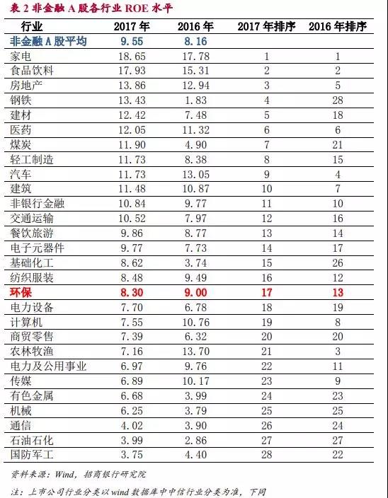 與A股其他行業(yè)相比較來看,環(huán)保行業(yè)ROE處于中游水平。2016年環(huán)保行業(yè)ROE為9.0%,處于28個(gè)行業(yè)中的第13位,明顯高于非金融A股的平均水平。而2017年環(huán)保行業(yè)ROE有所下滑,而周期行業(yè)的利潤出現(xiàn)了明顯的回升,使環(huán)保行業(yè)的ROE水平明顯低于非金融類A股的平均投資回報(bào)率,排序也下降到第17位。