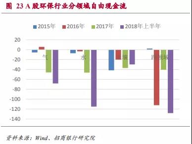圖23顯示大氣環(huán)保和水體環(huán)保領(lǐng)域的自由現(xiàn)金流從2017年起出現(xiàn)大量缺口,而跨領(lǐng)域自由現(xiàn)金流缺口最大,同時(shí)波動(dòng)幅度也較大。這三個(gè)領(lǐng)域經(jīng)營性現(xiàn)金流都不能滿足行業(yè)快速擴(kuò)張的需求。土壤環(huán)保相對(duì)缺口較小,這很有可能是土壤環(huán)保目前還處于探索階段,大規(guī)模投資還未啟動(dòng)導(dǎo)致的。