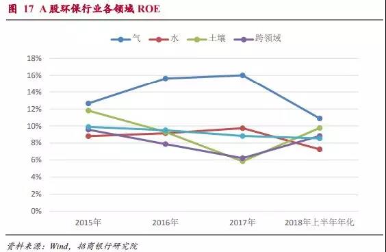 由于大氣環(huán)保在環(huán)保各領(lǐng)域中屬于輕資產(chǎn)的,所以其ROE水平一直屬于最高水平,但今年上半年出現(xiàn)明顯回落。同時(shí)水體環(huán)保作為環(huán)保領(lǐng)域資產(chǎn)占比最高的領(lǐng)域,ROE水平也是3年來首次出現(xiàn)回落。由于季節(jié)性原因,企業(yè)盈利存在上下半年的顯著差異;同時(shí)考慮到下半年貨幣政策有放松的可能,目前還無法斷定這兩個(gè)領(lǐng)域ROE下降趨勢是否已經(jīng)形成。