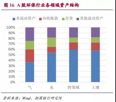 從各領(lǐng)域資產(chǎn)分布的情況來看,大氣領(lǐng)域的非流動(dòng)資產(chǎn)占比最低,同時(shí)應(yīng)收賬款的比例明顯偏高。這與大氣環(huán)保領(lǐng)域上市公司多數(shù)以工程和制造為主、運(yùn)營偏少的業(yè)務(wù)模式有關(guān)。