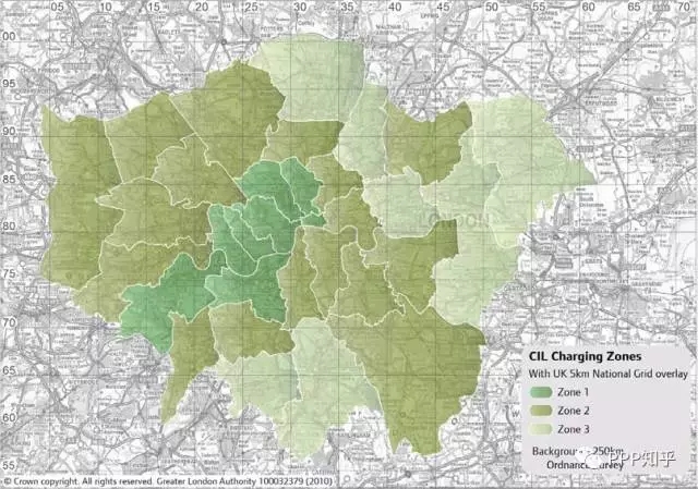 另一方面,對新建的房地產(chǎn)項目征收社區(qū)基建費(CIL-Community Infrastructure Levy),涉及的社區(qū)基礎設施費征收范圍如下圖所示,分為3檔稅率,分別為£50/平方米、£35/平方米、£20/平方米。