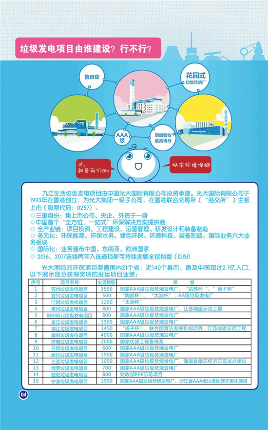 同杭州九峰垃圾焚燒發(fā)電項目一樣,九江垃圾焚燒發(fā)電項目也將由中國光大國際有限公司投資、建設、運營。據(jù)了解,光大國際在全國各地先后投資、建設、運營99個項目,日處理生活垃圾規(guī)模超過8萬噸,成為國內(nèi)垃圾焚燒發(fā)電行業(yè)領頭羊。光大國際所投資建設的垃圾發(fā)電項目均采用機械爐排爐工藝,煙氣排放執(zhí)行最為嚴格的歐盟2010標準,煙氣監(jiān)測系統(tǒng)與當?shù)丨h(huán)保部門在線聯(lián)網(wǎng),各種排放指標向社會及時公布。垃圾滲濾液的綜合處理開創(chuàng)了國內(nèi)“先河”,以一個個環(huán)境優(yōu)美的花園式垃圾焚燒發(fā)電項目,向社會、居民、各地政府鄭重兌現(xiàn)了承諾。