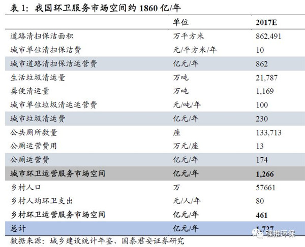 環(huán)衛(wèi)服務(wù)市場(chǎng)空間測(cè)算:保守估計(jì)每年城市1400億+鄉(xiāng)村460億。1)城市:假設(shè)城市單位清掃保潔費(fèi)、城市單位垃圾清運(yùn)運(yùn)營費(fèi)、公廁運(yùn)營費(fèi)用分別為10元/平方米/年、100元/噸/年、13萬元/座/年,2017及2018年城市道路清掃保潔面積、生活垃圾清運(yùn)量、糞便清運(yùn)量、公共廁所數(shù)量增速分別為8.5%、7.0%、-10.0%、3.0%,可計(jì)算出2018年城市環(huán)衛(wèi)運(yùn)營服務(wù)市場(chǎng)空間為1358億。2)鄉(xiāng)村:假設(shè)鄉(xiāng)村人均環(huán)衛(wèi)支出為80元/人/年,根據(jù)2017年我國鄉(xiāng)村常住人口57661萬人,測(cè)算出鄉(xiāng)村環(huán)衛(wèi)運(yùn)營服務(wù)市場(chǎng)空間461億。