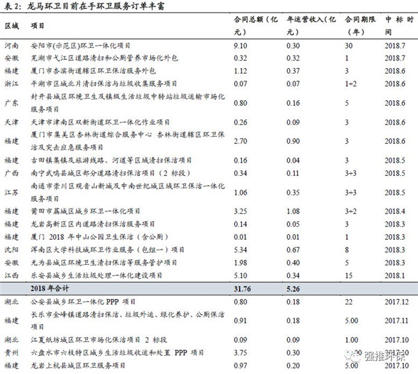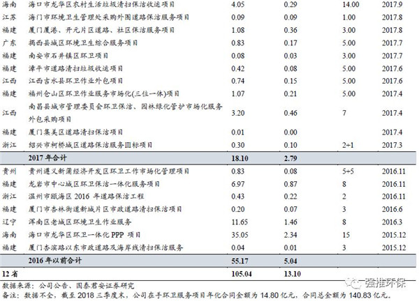 環(huán)衛(wèi)服務(wù)快速發(fā)展,在手訂單充足。公司從2015年開始開拓環(huán)衛(wèi)服務(wù)業(yè)務(wù),中標(biāo)海口龍華區(qū)及沈陽渾南區(qū)項(xiàng)目標(biāo)志公司具備全國拓展環(huán)衛(wèi)服務(wù)業(yè)務(wù)的能力。截至目前,公司在手環(huán)衛(wèi)服務(wù)項(xiàng)目年化合同金額為14.80億元,合同總金額為140.83億元,充足的在手訂單是未來業(yè)績(jī)高增長(zhǎng)的有力保障。