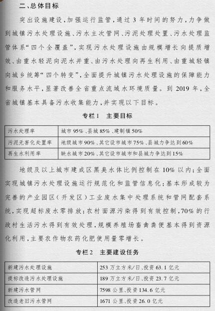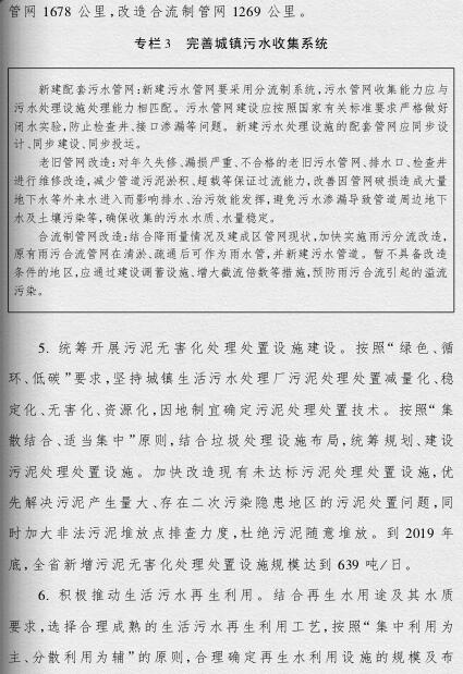 到2019年,全省城市和重點(diǎn)鎮(zhèn)實(shí)現(xiàn)污水處理設(shè)施建設(shè)全覆蓋,城鎮(zhèn)生活污水處理廠提標(biāo)改造基本完成,新增城鎮(zhèn)生活污水管網(wǎng)7598公里,改造老舊污水管網(wǎng)1678公里、合流制管網(wǎng)1269公里,新增污泥無害化處理處置設(shè)施規(guī)模達(dá)639噸/日,新增再生水利用設(shè)施規(guī)模達(dá)89萬立方米/日。
