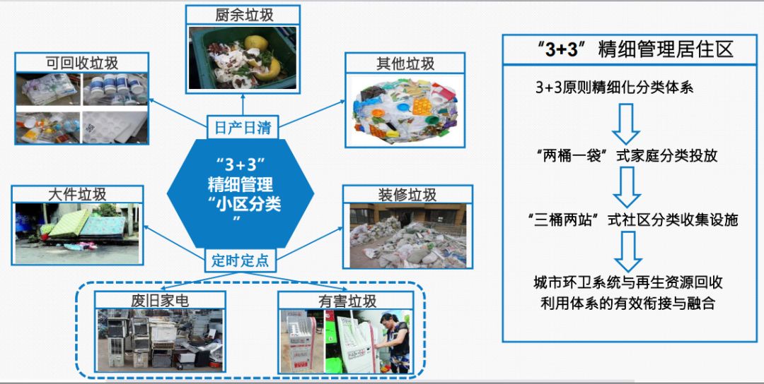 “3+3”模式實(shí)際上在社區(qū)里面分成五類垃圾——濕垃圾也就是廚余垃圾、可回收垃圾、其他垃圾、家具和大件垃圾、裝修垃圾,后來又分出了有害垃圾,但是有害垃圾界定困難而且較難收集,綜合來看實(shí)用性不大,比如手機(jī)丟棄后電池屬于有害垃圾,但是手機(jī)并不是有害的;燈管本來是用品不存在危害,燈管損壞以后汞是有害的,有人把燈管破碎以后進(jìn)行單獨(dú)收集,其實(shí)就是對(duì)汞的集中收集,由于汞是揮發(fā)的,在收集運(yùn)輸過程中更容易揮發(fā),但國內(nèi)如江蘇省、山東省明確提出要把有害垃圾列為垃圾的單獨(dú)一類。實(shí)際上居民家中理論上用品都是無害的,只有其出現(xiàn)破碎、損壞、丟棄的時(shí)候部分成分進(jìn)入到環(huán)境里才是有害的。