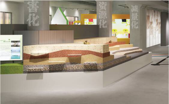 譬如,“焚燒處理流程”模型,含電動(dòng)抓取機(jī)械裝置,垃圾焚燒數(shù)據(jù)與老港焚燒廠同步。“生化處理流程”模型,內(nèi)藏LED燈帶,模擬濕垃圾處理流程。“衛(wèi)生填埋”沙盤,則仿地質(zhì)材料,直觀展示垃圾填埋操作工藝,包括滲瀝液如何收集與處理、填埋氣體如何利用等,模型背面設(shè)置可開啟的抽屜,展示可降解垃圾填埋若干年后的標(biāo)本。