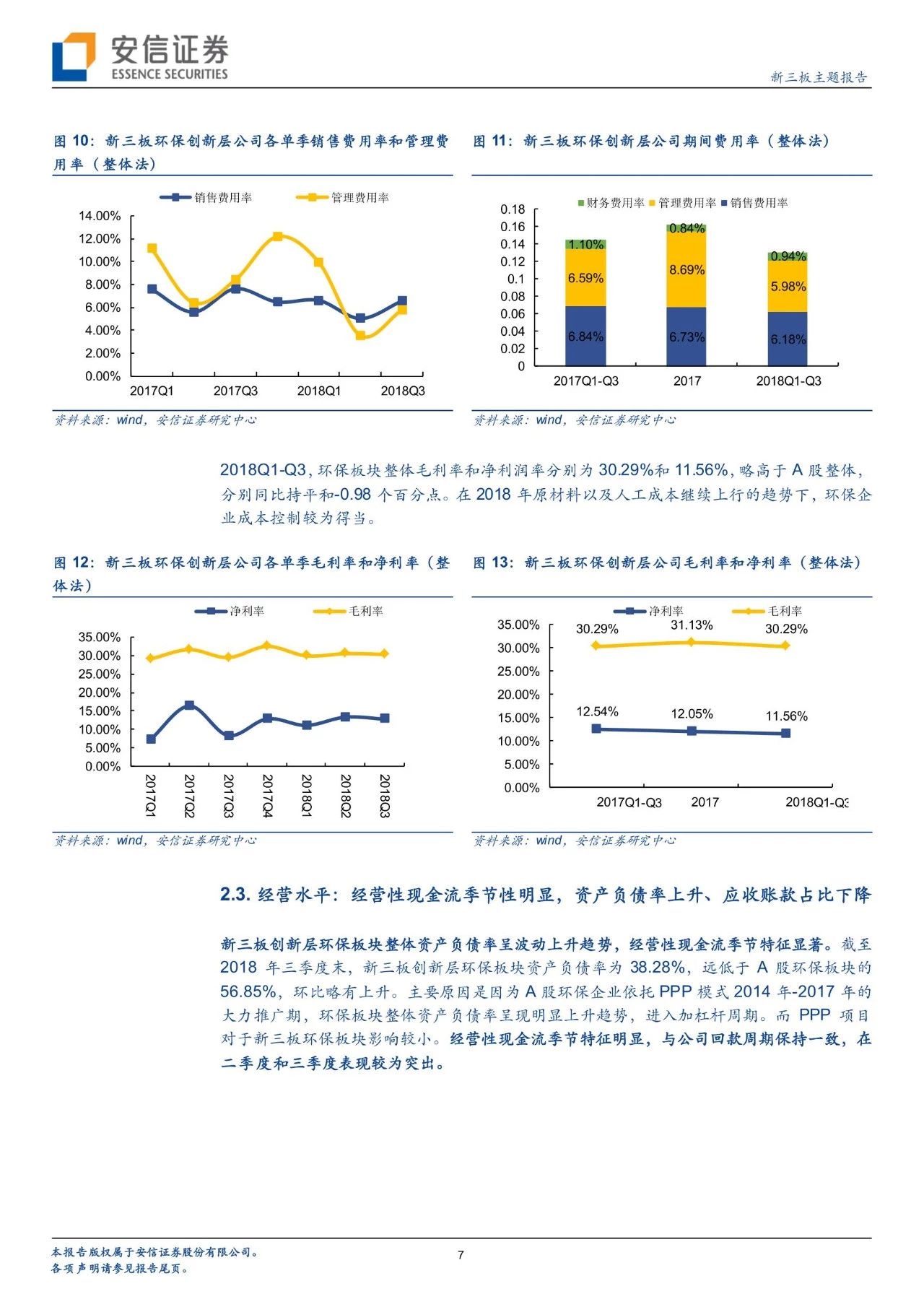 盈利能力:1)期間費(fèi)用:新三板環(huán)保板塊2018年前三季度銷售、管理、財(cái)務(wù)費(fèi)用率分別為6.18%、5.98%、0.94%,同比-0.66、-0.61、-0.16個(gè)百分點(diǎn),銷售、管理費(fèi)用率控制得當(dāng)。財(cái)務(wù)費(fèi)用率低于A股環(huán)保公司(A股為2%-3%),主要原因是因?yàn)锳股以PPP為主要模式,2018年以來(lái)利率信用收緊、利率繼續(xù)上行。2)2018Q1-Q3,新三板環(huán)保板塊整體毛利率和凈利率為30.29%、11.56%,略高于A股整體,分別同比持平和-0.98個(gè)百分點(diǎn)。