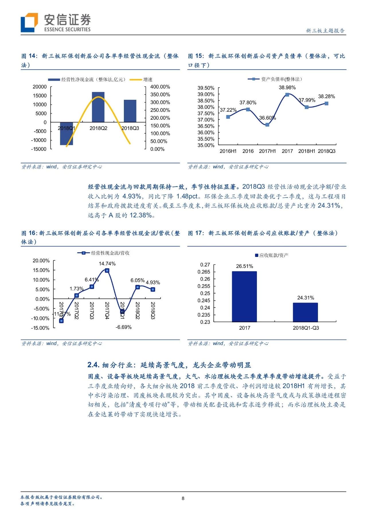 經(jīng)營(yíng)水平:截至2018年三季度末,新三板創(chuàng)新層環(huán)保板塊資產(chǎn)負(fù)債率為38.28%,遠(yuǎn)低于A股環(huán)保板塊的56.85%,主要原因是A股環(huán)保企業(yè)依托PPP模式,且2014年-2017年的大力推廣期,資產(chǎn)負(fù)債率呈現(xiàn)明顯上升,進(jìn)入加杠桿周期,而PPP項(xiàng)目對(duì)于新三板環(huán)保板塊影響較小。經(jīng)營(yíng)性現(xiàn)金流與回款周期保持一致,季節(jié)性特征顯著。2018Q3經(jīng)營(yíng)性活動(dòng)現(xiàn)金流凈額/營(yíng)業(yè)收入比例為4.93%,同比下降1.48pct。環(huán)保企業(yè)三季度回款要優(yōu)于二季度,這與工程項(xiàng)目結(jié)算和政府撥款進(jìn)度有關(guān)。截至三季度末,新三板環(huán)保板塊應(yīng)收賬款/總資產(chǎn)比重為24.31%,遠(yuǎn)高于A股的12.38%,主要與新三板環(huán)保企業(yè)議價(jià)能力有關(guān)。