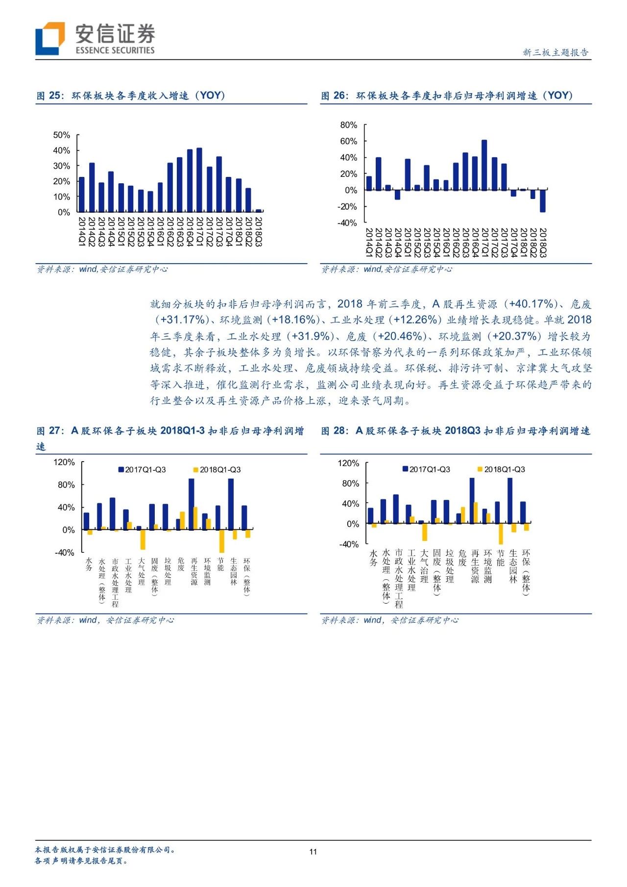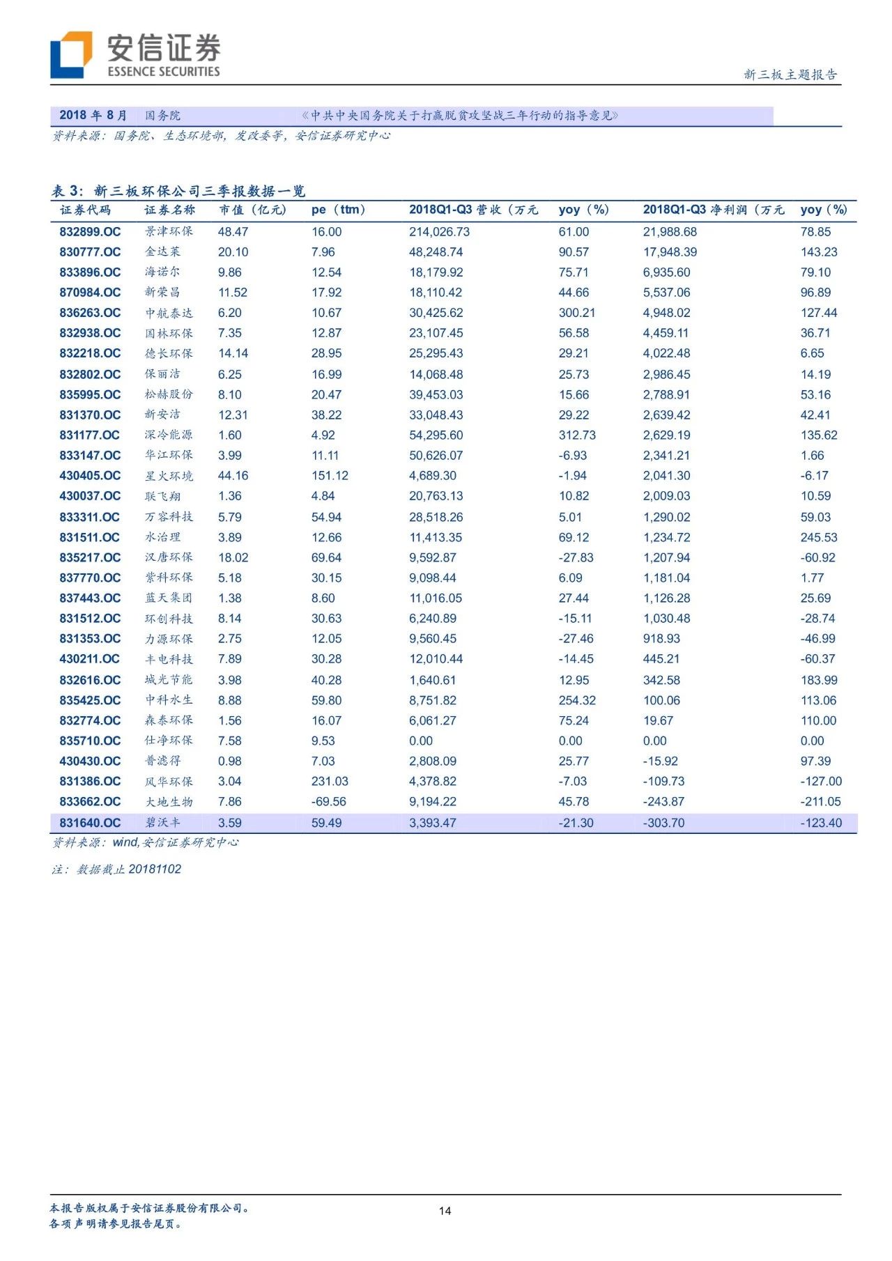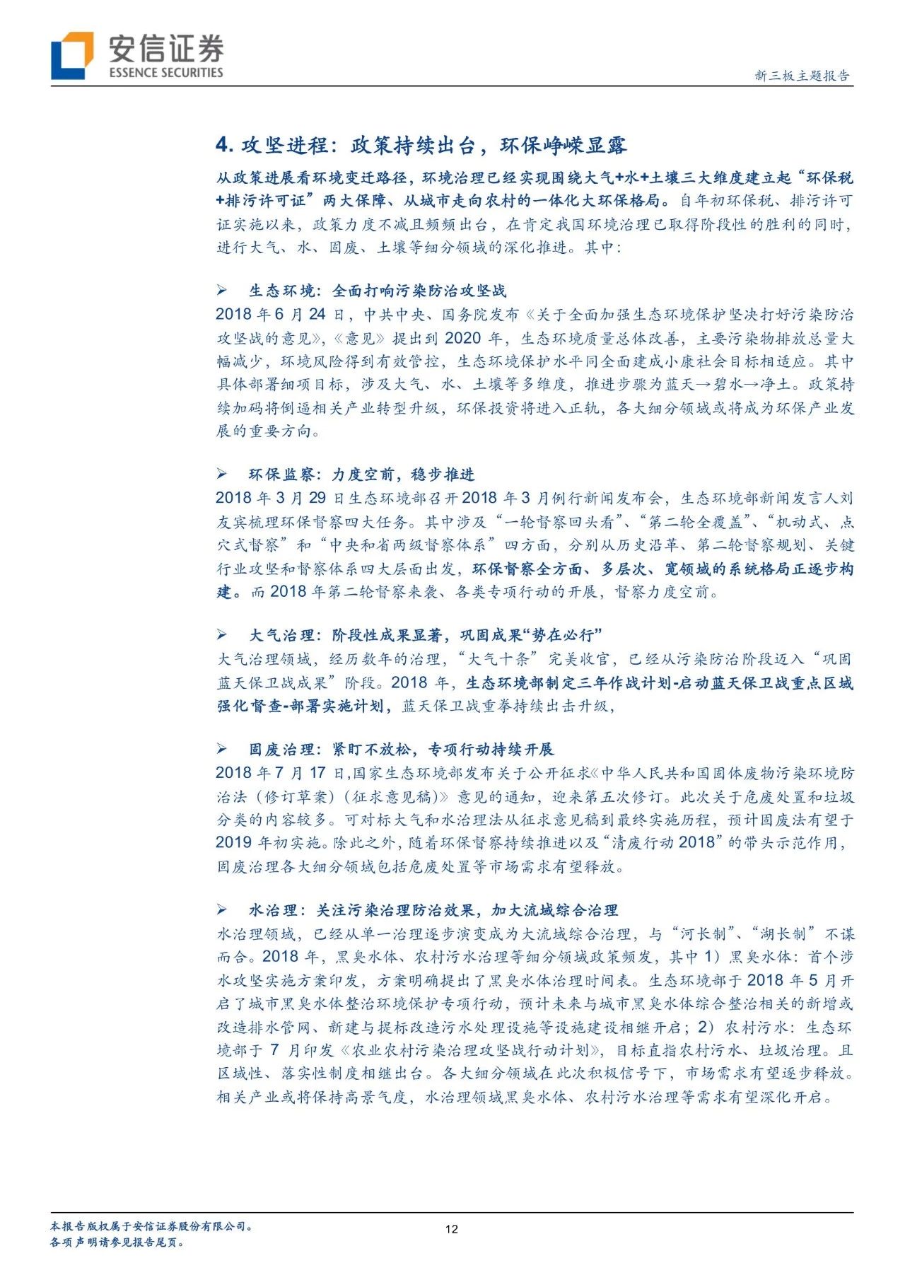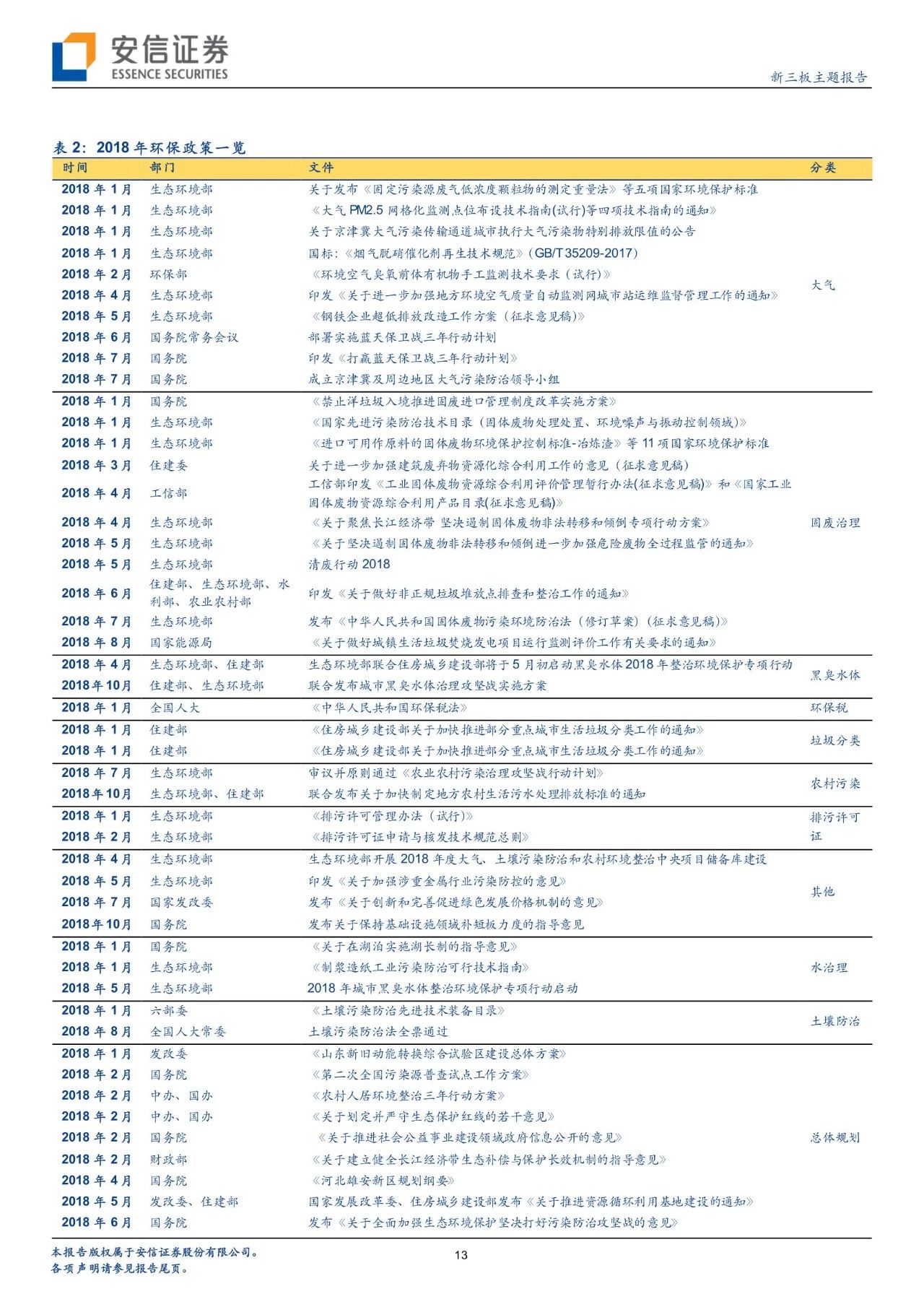 從政策進(jìn)展看環(huán)境變遷路徑,環(huán)境治理已經(jīng)實(shí)現(xiàn)圍繞大氣+水+土壤三大維度建立起“環(huán)保稅+排污許可證”兩大保障、從城市走向農(nóng)村的一體化大環(huán)保格局。自年初環(huán)保稅、排污許可證實(shí)施以來(lái),政策力度不減且頻頻出臺(tái),在肯定我國(guó)環(huán)境治理已取得階段性的勝利的同時(shí),進(jìn)行大氣、水、固廢、土壤等細(xì)分領(lǐng)域的深化推進(jìn)。我們對(duì)于2018年以來(lái)各細(xì)分板塊政策及變遷進(jìn)行了梳理。而新三板擁有400家公司,覆蓋了大氣治理、水治理、固廢治理等各個(gè)領(lǐng)域。我們繼續(xù)看好環(huán)保板塊,建議從政策推進(jìn)進(jìn)程中發(fā)掘潛在機(jī)會(huì),建議關(guān)注水治理、固廢治理和再生資源板塊投資機(jī)會(huì)。