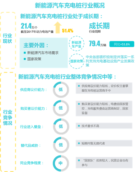 整體而言,新能源汽車充電樁行業(yè)供應(yīng)商議價以及購買者能力較低,定價權(quán)主要由充電樁運營商決定,其中運營商制定的服務(wù)費和電價由國家管控。由于該行業(yè)技術(shù)要求不高,進入壁壘較低,但需要滿足一定的軟性條件才可進入投標體系。此外,行業(yè)暫時沒有替代品,同業(yè)競爭程度為中等。綜上,我國新能源車充電樁行業(yè)競爭程度為中等,“國家隊”優(yōu)勢較大。
