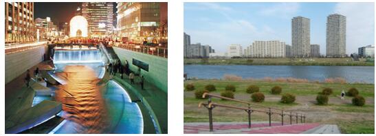 請注意概念中的“有限度”和“輔助”兩詞,在水生態(tài)修復(fù)中起決定作用的仍應(yīng)為自然修復(fù),工程僅為輔助河(湖)自我修復(fù)過程。圖1中左圖為清溪川城市段,其之所以在治理后得到很多人贊許,并非因為其生態(tài)性,而因其景觀優(yōu)美,景雖美卻無處不流漏出人工斧鑿的痕跡,圖1右圖為多摩川城市段,其雖不如清溪川華麗卻有著“清水出芙蓉,天然去雕飾?!钡臏喨惶斐傻拿栏小?/p>