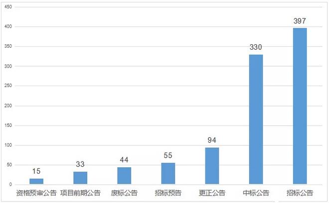11月上旬(11月1日-10日)全國(guó)各地共發(fā)布環(huán)衛(wèi)運(yùn)營(yíng)類項(xiàng)目公開(kāi)招標(biāo)采購(gòu)信息968個(gè),其中:項(xiàng)目前期公告33個(gè),招標(biāo)預(yù)告55個(gè),招標(biāo)公告397個(gè),資格預(yù)審公告15個(gè),更正公告94個(gè),中標(biāo)公告330個(gè),廢標(biāo)及流標(biāo)公告44個(gè)。